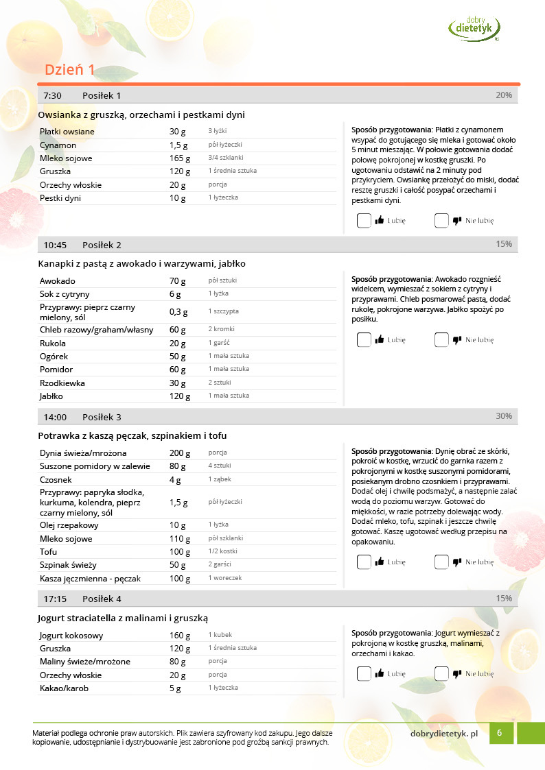 w formie propozycji posiłków (zamiast pojedynczych jadłospisów jednodniowych, przygotowano propozycje kilku propozycji dań na każdy posiłek). Tutaj nie uzależniamy Cię od tego jakie masz np. w danym dniu zjeść śniadanie czy obiad, tylko sam wybierasz sobie ulubione danie z kilku przedstawionych przez nas propozycji.