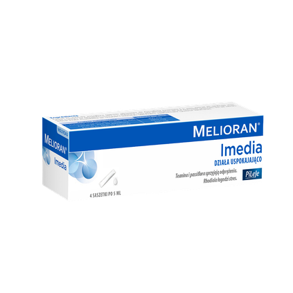 Melioran Imedia na bazie specjalnie wyselekcjonowanych składników: ekstraktów z L-teaniny, passiflory oraz rhodioli przeznaczony jest dla osób potrzebujących odprężenia w sytuacjach okazjonalnego stresu lub oczekiwania. Teanina i passiflora sprzyjają odprężeniu. Rhodiola łagodzi stres. Przeciwwskazania: Niezalecane dla dzieci poniżej 12 roku życia, kobiet w ciąży lub karmiących piersią oraz osób z chorobą afektywną dwubiegunową. W przypadku jednoczesnego stosowania leków psychotropowych skonsultuj się z lekarzem. Zaleca się monitorowanie stanu zdrowia jeśli Melioran przyjmowany jest jednocześnie z lekiem na nadciśnienie tętnicze.Rekomendowany do suplementacji w: